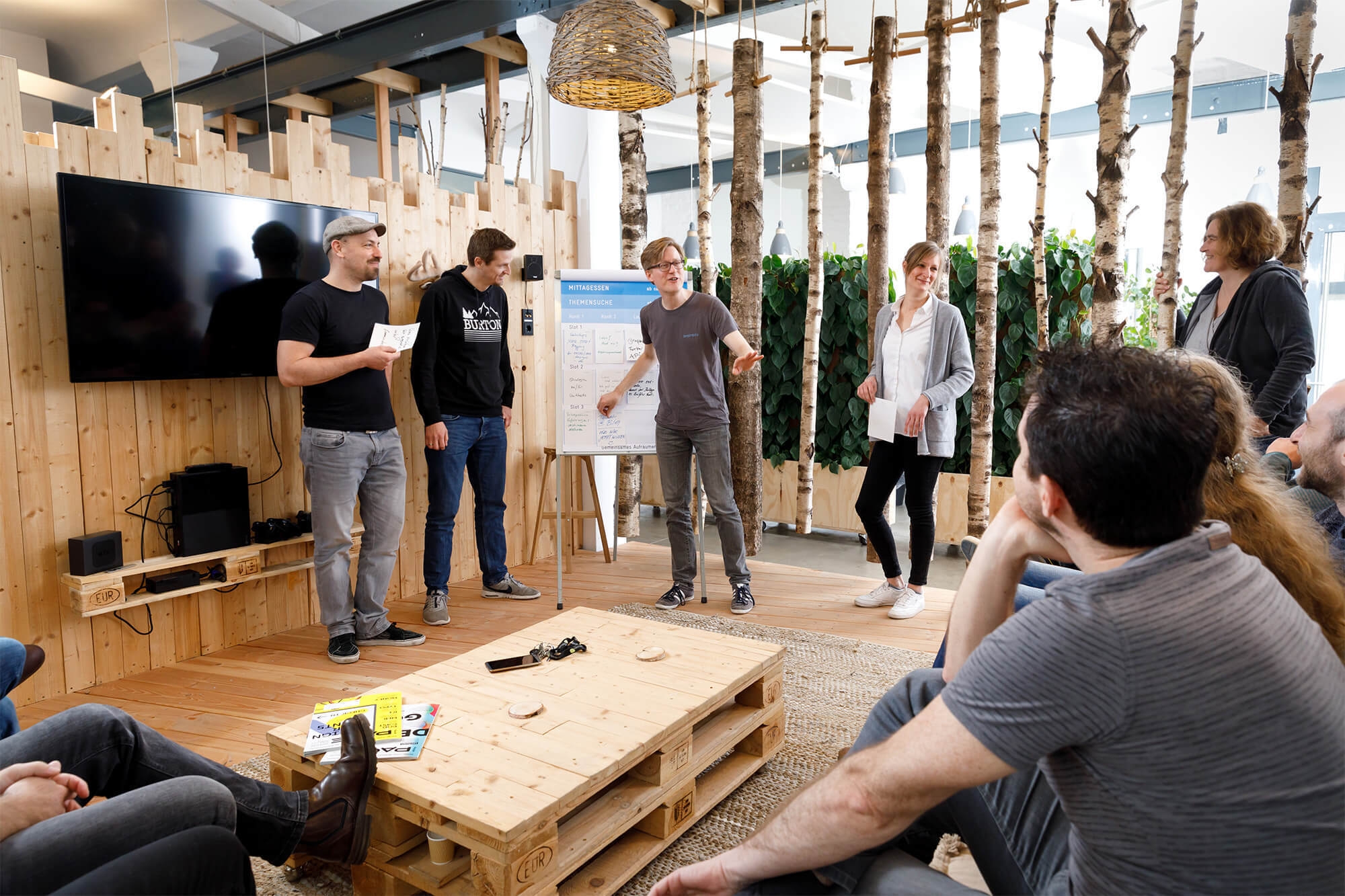 In unserem Alltag gibt es viele verschiedene Möglichkeiten, sich einzubringen. Das beginnt beim Lean Coffee und dem Montagsmeeting, zieht sich nahtlos durch slack und hört bei den zweimonatlich stattfindenden Open Fridays noch lange nicht auf. Unkompliziert, direkt und immer auf Augenhöhe hauen wir einander einfach an, um die nächste Innovation aus der Taufe zu heben – oder das nächste Mittagessen zu klären.